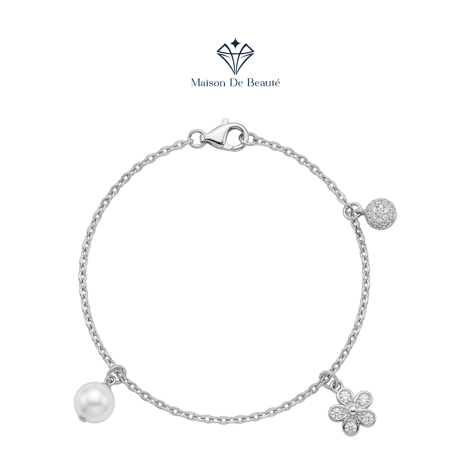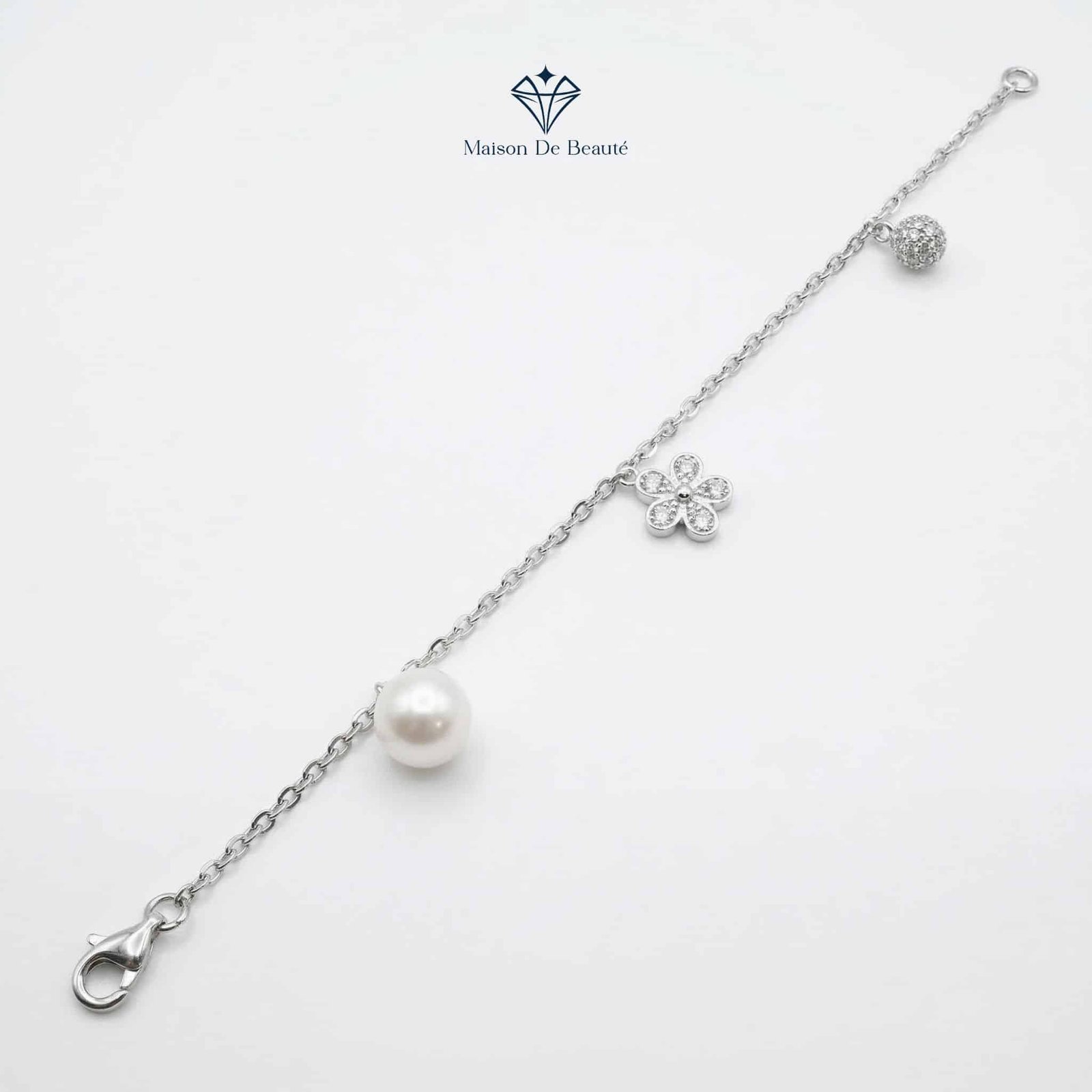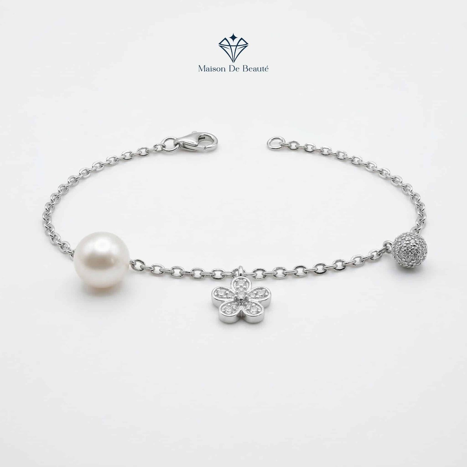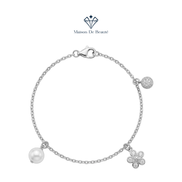 🌿 Điểm nhấn khác biệt với sự đan xen giữa một viên ngọc trai trắng tinh khôi, một quả cầu đính đá micro-pave và một charm hoa năm cánh điệu đà.